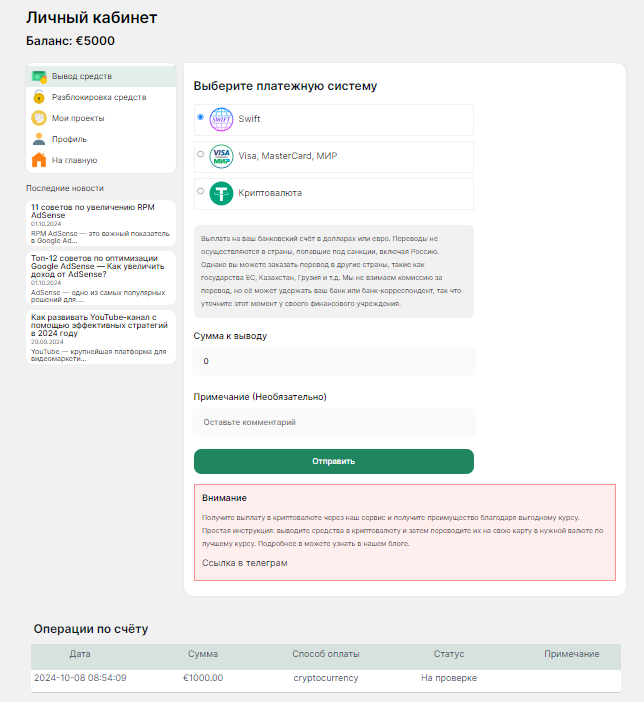 На этой странице вы можете управлять своими доходами с платформы и настраивать платежные системы для вывода.