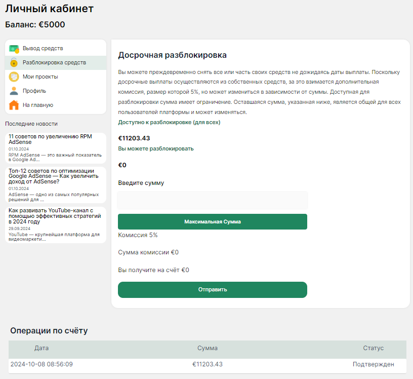 Если ваши средства временно заблокированы для вывода, здесь вы можете запросить их досрочную разблокировку.