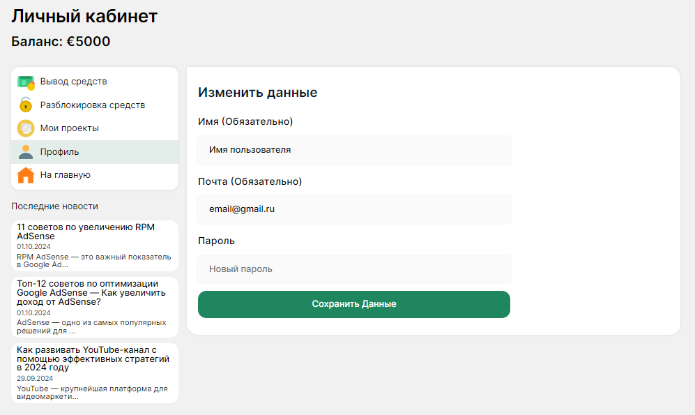После входа в личный кабинет вы попадёте на главную страницу, где видны ключевые показатели вашего аккаунта, такие как баланс доступных и заблокированных средств, уведомления о статусе проектов и последние транзакции. В верхней части экрана находятся ссылки на основные разделы: