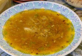 Суп с мясом и жареной пшенкой
